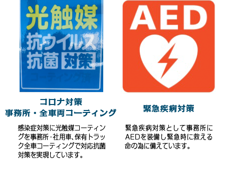 大切なお客様・大切な社員とその家族を守るため新型コロナ感染対策(光触媒コーティング)導入、まさかの時の緊急疾病対応にAEDを装備し、かけがえのない命を守ります。更に事故を防ぐための先進予防安全システム装備の新型車を積極的、継続的に導入して参ります。